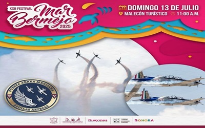 En el marco del XXII Festival Mar Bermejo 2025, el Ayuntamiento de Guaymas te invita a disfrutar el espectáculo de la Escuadrilla Acrobática “Águilas Aztecas” de la Fuerza Aérea Mexicana, que por primera vez se presentará en el estado de Sonora.