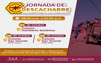 En equipo con Desarrollo Social, Servicios Públicos y Salud Pública Municipal y familias el Ayuntamiento de Guaymas promueve la Jornada de Descacharre en las colonias Humberto Gutiérrez y San Vicente (lado oeste y este), del 1 al 3 de octubre, indicó Austria Castro Gracia.